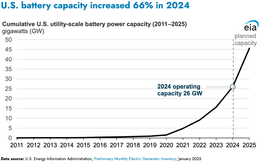 中國儲能網(wǎng)訊:根據(jù)美國能源信息署2025年1月的初步月度發(fā)電機組庫存數(shù)據(jù),在美國,截至2024年,美國累計公用事業(yè)規(guī)模的電池儲能容量已超過26吉瓦(GW)。2024年,美國發(fā)電企業(yè)新增了10.4吉瓦的電池儲能容量,僅次于太陽能發(fā)電,是當年第二大新增發(fā)電能力來源。盡管電池儲能容量增長迅速,但在2024年,它僅占美國1230吉瓦公用事業(yè)規(guī)模發(fā)電能力的2%。