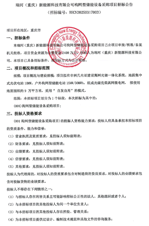 15MW/30MWh!瑞河(重慶)新能源科技有限公司構(gòu)網(wǎng)型儲能設(shè)備采購項目招標(biāo)