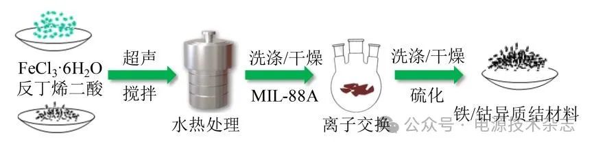 實驗中所涉及的樣品均為分析純,使用過程中不進行額外處理。目標(biāo)樣品的合成過程如圖1所示。首先分別稱取350 mg FeCl3·6 H2O和110 mg反丁烯二酸,然后經(jīng)超聲、攪拌等步驟溶解在30 mL去離子水中,隨后在110 ℃下水熱處理5 h,經(jīng)離心洗滌,得到MIL-88A。在離子交換過程中,分別稱取64 mg MIL-8A、750 mg 尿素和260 mg CoCl2·6 H2O溶解在50 mL溶劑(乙醇與水體積比為2∶3)中,在90 ℃的油浴中處理一定時間(2、4和6 h),經(jīng)離心洗滌,得到鐵/鈷前驅(qū)體。最后,按照1∶2的質(zhì)量比取一定量鐵/鈷前驅(qū)體和硫粉,在400 ℃氮氣氣氛下處理2 h,得到最終樣品。離子交換時間2、4和6 h得到的樣品分別標(biāo)記為FC-2、FC-4和FC-6。