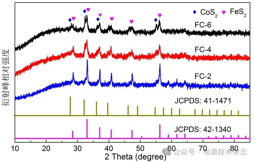 圖2給出了所制備樣品的XRD圖譜。從圖2中可以看出,當(dāng)離子交換時間為2 h時,樣品FC-2的主要衍射峰位置位于33.1o、37.1o、47.4o和56.3o,分別與黃鐵礦型FeS2 (JCPDS: 42-1340)的(200)、(210)、(220)和(311)晶面對應(yīng)[20-21]。除以上主要衍射峰外,樣品FC-2中未發(fā)現(xiàn)其他衍射峰,這可能與較短的離子交換時間導(dǎo)致樣品中鈷離子含量相對較低有關(guān)。當(dāng)離子交換時間增加到4和6 h時,除FeS2的特征衍射峰以外,在27.8o、32.3o、36.2o和54.9 o處出現(xiàn)了新的衍射峰,對應(yīng)的是立方相CoS2 (JCPDS: 41-1471)的(111)、(200)、(210)和(311)晶面的特征衍射峰[22-23]。此外,隨著離子交換時間的延長,CoS2特征衍射峰的強度也逐漸增加,表明樣品中CoS2的含量隨著離子交換時間的增加而增加。