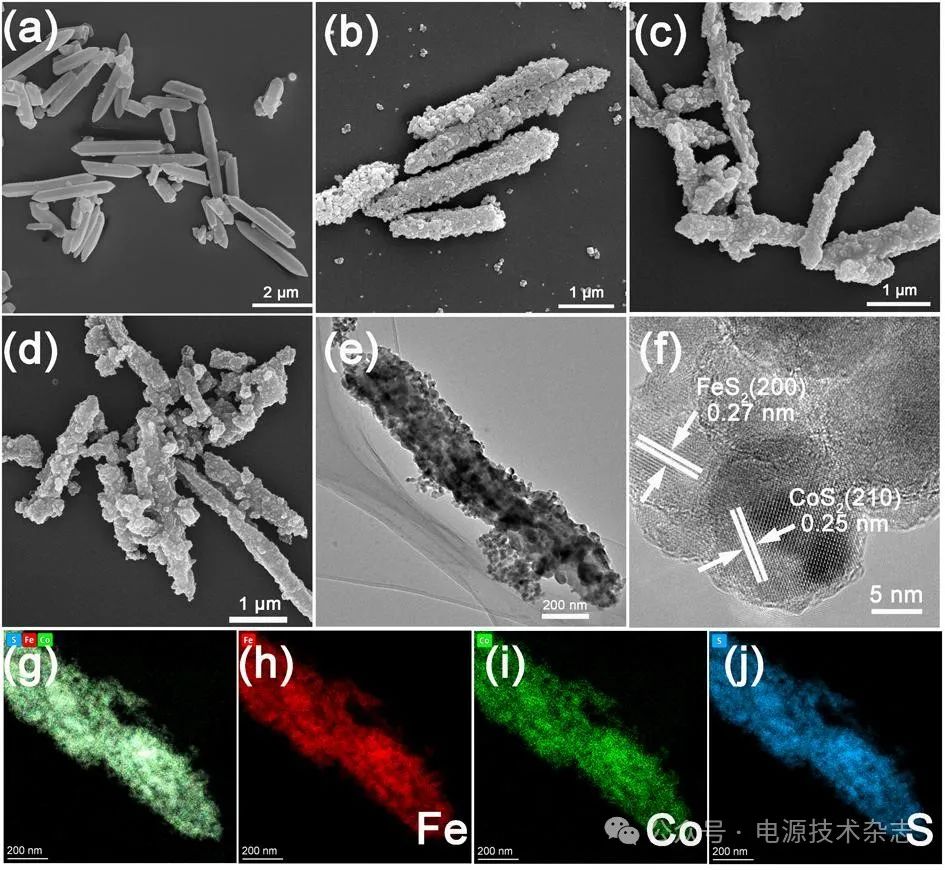 圖3(a)為前驅(qū)體MIL-88A的SEM圖,可以看出,未經(jīng)處理的MIL-88A前驅(qū)體表現(xiàn)出單分散的棱柱狀結(jié)構(gòu),這與文獻報道一致[24]。圖3(b)~(d)分別為樣品FC-2、FC-4和FC-6的SEM圖,可以看出,經(jīng)過后續(xù)離子交換和硫化處理,目標(biāo)樣品的表面變得較為粗糙。樣品FC-2和FC-4相對較好地保持了前驅(qū)體MIL-88A的棱柱狀結(jié)構(gòu),而樣品FC-6的棱柱狀結(jié)構(gòu)遭到破壞,且出現(xiàn)一定程度的團聚。圖3(e)為樣品FC-4的TEM圖,可以看出,目標(biāo)樣品表現(xiàn)出小顆粒組裝成的柱狀結(jié)構(gòu),其長度約為2 μm。圖3(f)為FC-4的高分辨率透射電鏡圖(HRTEM)圖,可以觀察到晶格間距為0.27和0.25 nm的晶格條紋,分別對應(yīng)的是FeS2的(200)晶面和CoS2的(210)晶面[25-26]。此外,F(xiàn)eS2顆粒和CoS2顆粒界面緊密接觸,形成異質(zhì)結(jié),這對電化學(xué)儲鈉性能的提升是有利的[11,27-28]。圖3(g)~(j)給出了樣品FC-4的能量色散X射線譜(EDS)元素分布照片,可以看出,元素鐵、鈷和硫的分布完全一致,這一結(jié)果也很好地佐證了經(jīng)過離子交換過程,鈷離子進入到了目標(biāo)樣品中。