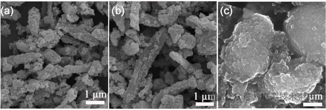 為直觀揭示樣品電化學(xué)循環(huán)性能的差異,表征了樣品在循環(huán)150次以后的SEM圖,如圖6所示,可以看出,樣品FC-2和FC-4循環(huán)后基本能夠保持原有的形貌,而樣品FC-6在循環(huán)后,其原有的棱柱狀結(jié)構(gòu)坍塌,同時活性組分出現(xiàn)團聚,這與其電化學(xué)儲鈉性能迅速衰減直接相關(guān)[33]。