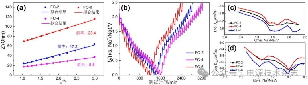 圖8 不同樣品的ZRe和ω1/2的線性關(guān)系(a)、GITT曲線(b)、充電過程(c)和放電過程(d)中的鈉離子擴散系數(shù)