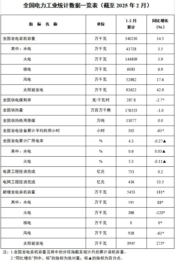 截至2月底,全國累計(jì)發(fā)電裝機(jī)容量34.0億千瓦,同比增長(zhǎng)14.5%。其中,太陽能發(fā)電裝機(jī)容量9.3億千瓦,同比增長(zhǎng)42.9%;風(fēng)電裝機(jī)容量5.3億千瓦,同比增長(zhǎng)17.6%。