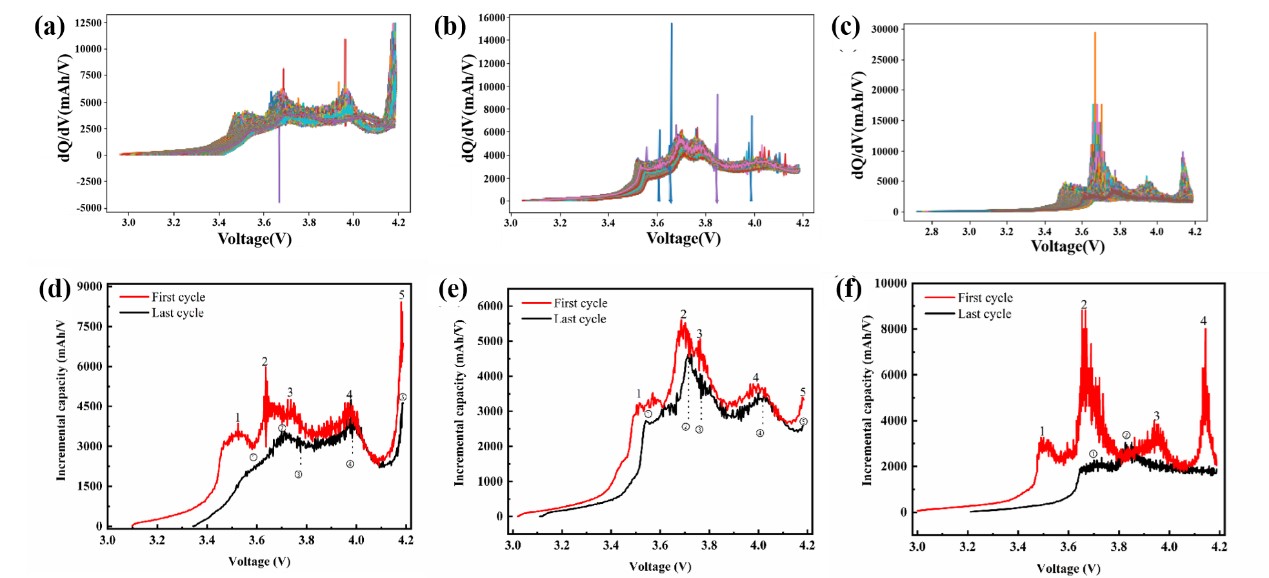 數(shù)據(jù)集3的電池采用NCM+NCA混合正極和石墨負極,其中一個電池的首末圈IC曲線變化趨勢如圖2f所示。IC曲線的每個峰均顯著右移,表明各相變過程對應(yīng)的平臺電壓顯著升高,反映了電池內(nèi)阻的大幅增加。四個特征峰均隨循環(huán)顯著衰減。特征峰1(3.50 V)、峰2(3.68 V)和峰3(3.96 V)分別對應(yīng)石墨負極的脫鋰反應(yīng)、NCM/NCA正極的嵌鋰反應(yīng)以及三元材料的副反應(yīng)。特征峰4由于內(nèi)阻較高,因此相應(yīng)的相變過程轉(zhuǎn)移至恒壓充電階段,導(dǎo)致該峰從IC曲線中消失。綜上所述,電池內(nèi)阻的顯著增加、正負極活性材料的損失以及副反應(yīng)和SEI膜生長導(dǎo)致的活性鋰離子損失共同導(dǎo)致了電池的容量衰減。