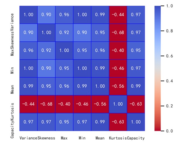 從圖3可以看出,上述六項特征值與容量衰減高度相關(guān),且均呈現(xiàn)出從大到小的變化趨勢。使用皮爾斯相關(guān)系數(shù)分析特征值與容量的相關(guān)性,相關(guān)性熱力圖由圖4所示。從圖4可知峰度與容量的皮爾森相關(guān)系數(shù)較低,絕對值為0.63,且在大約400次循環(huán)后呈現(xiàn)出相對明顯的上升趨勢,表明數(shù)據(jù)中的極值增加,這意味著電池循環(huán)壽命的中后期出現(xiàn)了更多的極端情況。其他五項特征值與容量的Pearson相關(guān)系數(shù)分別為0.97、0.97、0.95、0.97和0.99,證明了所提取的特征與容量衰減情況關(guān)聯(lián)度極高。
