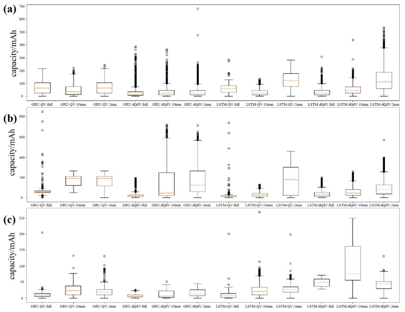 同樣,隨著數(shù)據(jù)覆蓋時間段的增加,估計精度持續(xù)提高。前2分鐘、前10分鐘和完整充電段的MAPE最大值分別為2.5%、1.3%和0.88%。在本研究中,更多的數(shù)據(jù)覆蓋了正負極活性材料更多的相變過程。這可以為模型學(xué)習(xí)提供不同電壓下材料相變和衰減的更多信息,從而實現(xiàn)更高的估計精度。