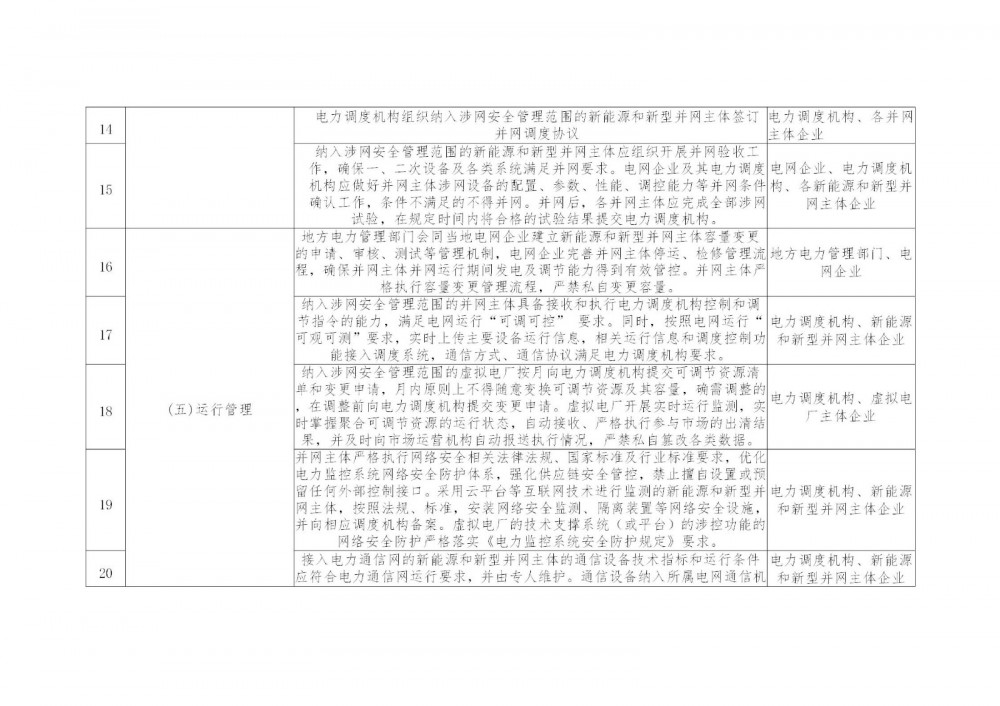 涉網安全管理應統(tǒng)籌考慮各電源型并網主體對電網電源平衡、頻率穩(wěn)定、電壓調節(jié)、電能質量、系統(tǒng)慣量與短路容量、抑制寬頻振蕩等方面的影響及各負荷型并網主體對電網負荷特性、需求響應能力等方面的影響,加強相關設備安全、控制策略、技術特性、運行參數的管理,重點滿足網源協(xié)調相關技術標準規(guī)范、轄區(qū)電網安全運行、監(jiān)控系統(tǒng)網絡安全以及涉網風險管控等工作要求,包括責任落實、涉網性能、參數管理、并網接入、并網運行管理、存量主體涉網性能改造等六方面,具體工作及責任單位詳見新能源和新型并網主體涉網安全管理重點工作清單(附件)。