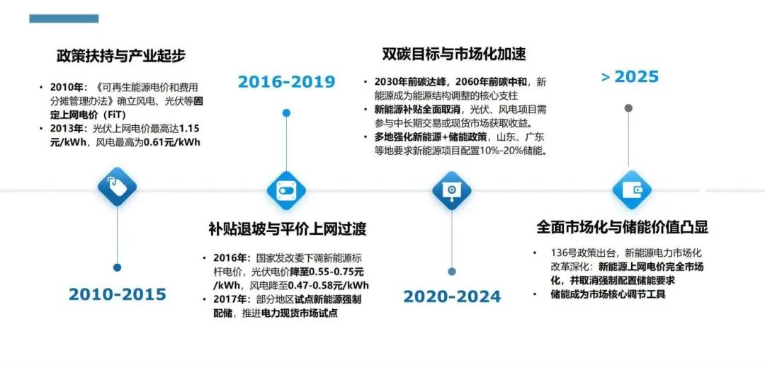 為推動(dòng)我國(guó)能源體系朝著雙碳目標(biāo)加速轉(zhuǎn)型,我國(guó)光伏和風(fēng)電的發(fā)電電價(jià)政策歷經(jīng)了從固定補(bǔ)貼電價(jià)(FiT)到市場(chǎng)化交易的重大變革。2010 年,我國(guó)開(kāi)始實(shí)行固定上網(wǎng)電價(jià)政策;2019 年,國(guó)家引入競(jìng)價(jià)機(jī)制,要求新能源項(xiàng)目通過(guò)競(jìng)爭(zhēng)確定補(bǔ)貼標(biāo)準(zhǔn),并啟動(dòng)首批平價(jià)上網(wǎng)試點(diǎn);如今,136 號(hào)政策的發(fā)布,進(jìn)一步深化市場(chǎng)化改革,要求新能源發(fā)電全面進(jìn)入市場(chǎng)交易。這一系列舉措使得電價(jià)波動(dòng)性增大,同時(shí)也有力地推動(dòng)了儲(chǔ)能、電力調(diào)度等配套產(chǎn)業(yè)的發(fā)展。