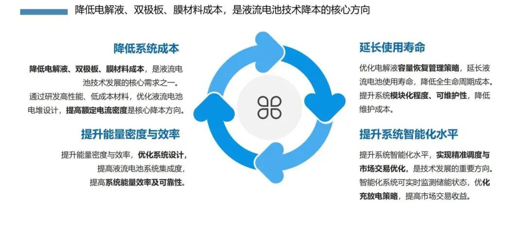 降低電解液、雙極板以及膜材料的成本,是液流電池技術(shù)發(fā)展的核心訴求之一。其關(guān)鍵降本路徑在于研發(fā)高性能且低成本的材料,優(yōu)化液流電池的電堆設(shè)計(jì),以及提高額定電流密度。同時(shí),提升能量密度與效率、優(yōu)化系統(tǒng)設(shè)計(jì)、提高系統(tǒng)集成度、增強(qiáng)系統(tǒng)能量效率及可靠性,也是技術(shù)升級(jí)的關(guān)鍵所在。