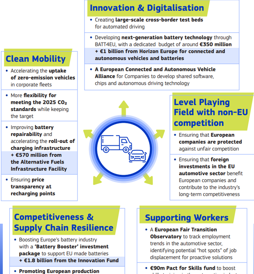 該行動計劃將支持整個汽車行業(yè)向清潔、互聯(lián)和日益自動化的汽車轉(zhuǎn)型,以確保其國際競爭力。為實現(xiàn)這一目標,該計劃將解決五個關(guān)鍵優(yōu)先事項:1)創(chuàng)新和數(shù)字化,2)轉(zhuǎn)向清潔出行,3)確保競爭力和供應(yīng)鏈韌性,4)提高技能和解決社會問題,5)保證公平的競爭環(huán)境和有競爭力的商業(yè)環(huán)境。