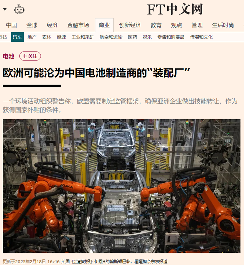 歐盟環(huán)境組織“運輸與環(huán)境”(Transport & Environment)今年2月就發(fā)布報告稱,除非歐洲實行旨在確保以技術(shù)和技能轉(zhuǎn)讓換取國家援助的法規(guī),否則它可能成為中國電池制造商的“裝配廠”。