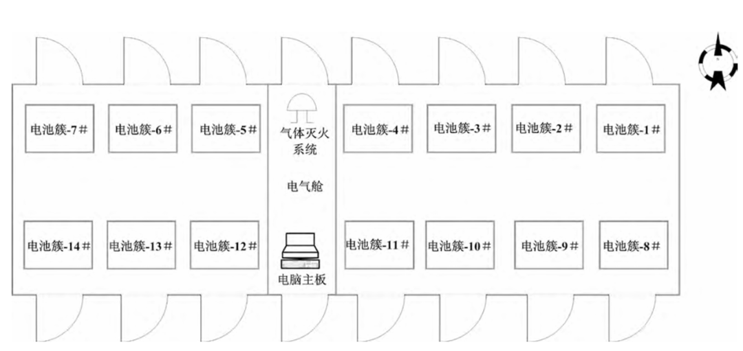 該儲能電站設(shè)有4座集裝箱式儲能電池艙及儲能升壓一體艙。每個電池艙內(nèi)含14個電池簇,每個電池簇內(nèi)裝配25個電池模塊。此次起火艙室為1號電池艙。