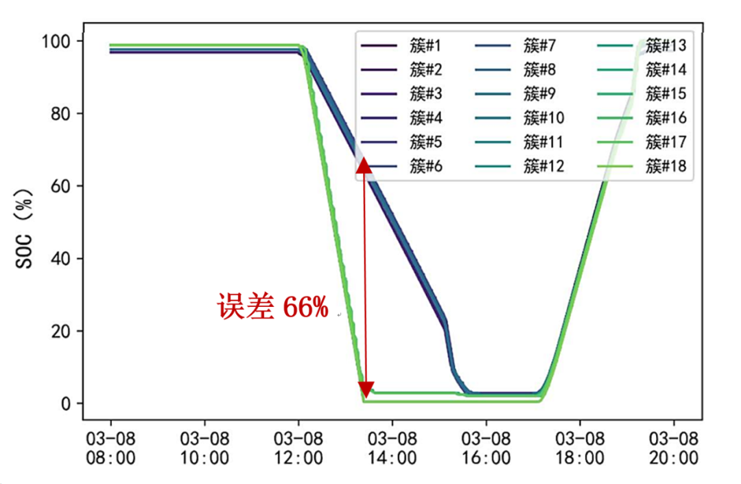 圖3:某儲能電站BMS評估各簇SOC一致性良好的電池時出現(xiàn)近66%的誤差