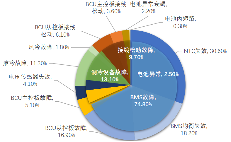 2)電站安全隱患辨識及診斷:基于模式識別算法可對電站內(nèi)存在的安全風(fēng)險隱患—如BMS對SOC評估不準(zhǔn)、傳感器失效、均衡失效以及熱管理系統(tǒng)故障等問題進(jìn)行識別、定位、告警,避免因BMS失效或熱管理系統(tǒng)故障造成電池濫用。在西清儲能主動安全系統(tǒng)歷史檢出電站故障中,有近75%為BMS故障,13.1%為制冷設(shè)備故障。