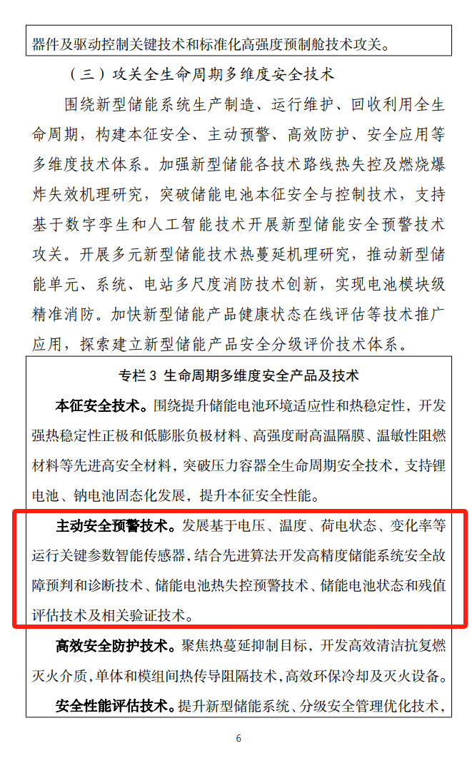 2025年2月17日,工信部等八部門聯(lián)合印發(fā)《新型儲能制造業(yè)高質(zhì)量發(fā)展行動方案》,明確提出“加強新型儲能各技術(shù)路線熱失控及燃燒爆炸失效機理研究,發(fā)展基于電壓、溫度、荷電狀態(tài)、變化率等運行關(guān)鍵參數(shù)智能傳感器,結(jié)合先進(jìn)算法開發(fā)高精度儲能系統(tǒng)安全故障預(yù)判和診斷技術(shù)、儲能電池?zé)崾Э仡A(yù)警技術(shù)、儲能電池狀態(tài)和殘值評估技術(shù)及相關(guān)驗證技術(shù)”,該方案嚴(yán)密契合將電站安全防控建設(shè)融入日常安全評估、早期故障檢出和重大事故預(yù)警三大環(huán)節(jié),實現(xiàn)安全防控主動、科學(xué)與體系化的實踐要求。