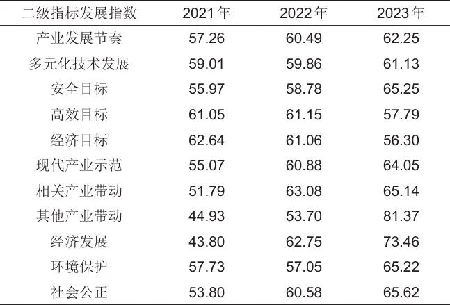 最終計(jì)算得出2021—2023年儲能產(chǎn)業(yè)高質(zhì)量發(fā)展綜合指數(shù)、各一級指標(biāo)發(fā)展指數(shù)、各二級指標(biāo)發(fā)展指數(shù)如表4~表6所示。