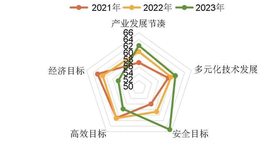 (2)對綜合指標(biāo)體系中二級指標(biāo)更深入地分析表明各個(gè)維度的發(fā)展也存在著不同的問題。在“服務(wù)電力系統(tǒng)轉(zhuǎn)型升級”維度,高效目標(biāo)和經(jīng)濟(jì)目標(biāo)得分持續(xù)走低,安全目標(biāo)得分雖大幅提升,但儲能電站安全性仍堪憂,非計(jì)劃停運(yùn)次數(shù)由2021年的22.64次/100 MWh提升至2023年的26.73次/100 MWh。在“推動(dòng)現(xiàn)代化產(chǎn)業(yè)體系建設(shè)”維度,產(chǎn)能利用率連年降低至不足50%,鈷、鎳資源的對外依存度居高不下,均保持在90%以上。在“促進(jìn)經(jīng)濟(jì)社會可持續(xù)發(fā)展”維度,儲能相關(guān)企業(yè)2021—2023年的平均全要素生產(chǎn)率分別為3.43、3.72、3.38,呈波動(dòng)下降趨勢,儲能產(chǎn)業(yè)整體碳排放隨生產(chǎn)規(guī)模的迅速擴(kuò)大也呈翻倍式增長。