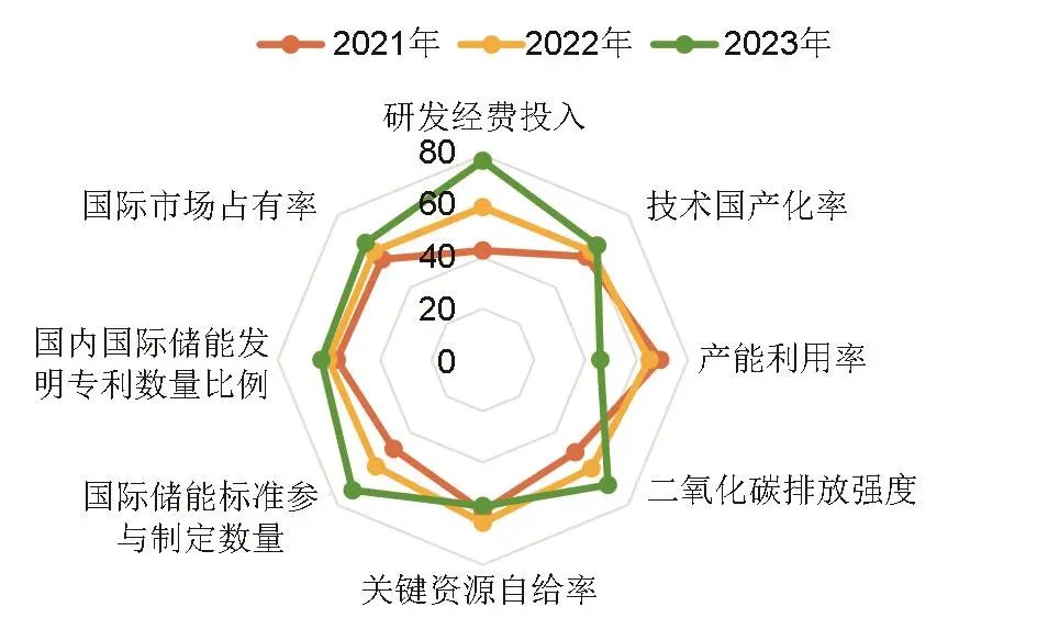 (2)“推動(dòng)現(xiàn)代化產(chǎn)業(yè)體系建設(shè)”維度的二級指標(biāo)發(fā)展指數(shù)均實(shí)現(xiàn)了不同程度的提升,如圖3所示?!捌渌a(chǎn)業(yè)帶動(dòng)”方面的表現(xiàn)最為亮眼,原因在于儲能的滲透率呈飛躍式增長,工商業(yè)儲能總裝機(jī)規(guī)模從2021年的730 MWh升至2023年的1797 MWh,增長率接近146%。鑒于“現(xiàn)代產(chǎn)業(yè)示范”所涵蓋的三級指標(biāo)數(shù)量眾多,本文針對性地進(jìn)行了細(xì)致剖析,相應(yīng)三級指標(biāo)變化情況如圖4所示。由圖4可知,儲能產(chǎn)業(yè)在科技自立自強(qiáng)和國際產(chǎn)業(yè)高地建設(shè)方面取得良好成效,所有相關(guān)指標(biāo)持續(xù)向好,但是在產(chǎn)業(yè)鏈供應(yīng)鏈方面,盡管綠色供應(yīng)鏈的發(fā)展呈現(xiàn)出積極態(tài)勢,但產(chǎn)業(yè)鏈供應(yīng)鏈的韌性和安全性并未同步增強(qiáng)。產(chǎn)能利用率連年下跌至不足50%,折射出產(chǎn)業(yè)內(nèi)部協(xié)作機(jī)制與有序發(fā)展尚處于較低的水準(zhǔn),此外,鋰鈷鎳關(guān)鍵原材料的高度進(jìn)口依賴問題依然嚴(yán)峻,除鋰資源對外依存度在近年有10%左右的下降外,鈷、鎳資源的對外依存度在2023年已經(jīng)分別達(dá)到了99%和95%。