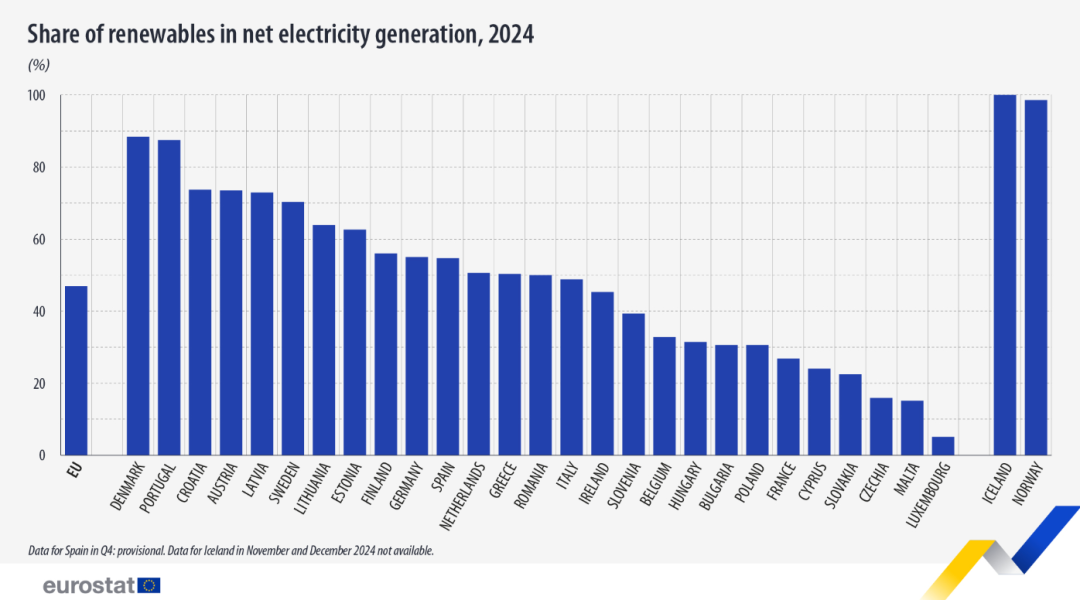 中國(guó)儲(chǔ)能網(wǎng)訊:據(jù)歐盟統(tǒng)計(jì)局的發(fā)表數(shù)據(jù),2024年歐盟凈發(fā)電量中有46.9%來(lái)自可再生能源。在歐盟國(guó)家中,丹麥的凈發(fā)電量中可再生能源占比最高,達(dá)到88.4%,主要來(lái)自風(fēng)能,其次是葡萄牙(87.5%,主要來(lái)自風(fēng)能和水能)和克羅地亞(73.7%,主要來(lái)自水能)??稍偕茉凑急茸畹偷膰?guó)家是盧森堡(5.1%)、馬耳他(15.1%)和捷克(15.9%)。