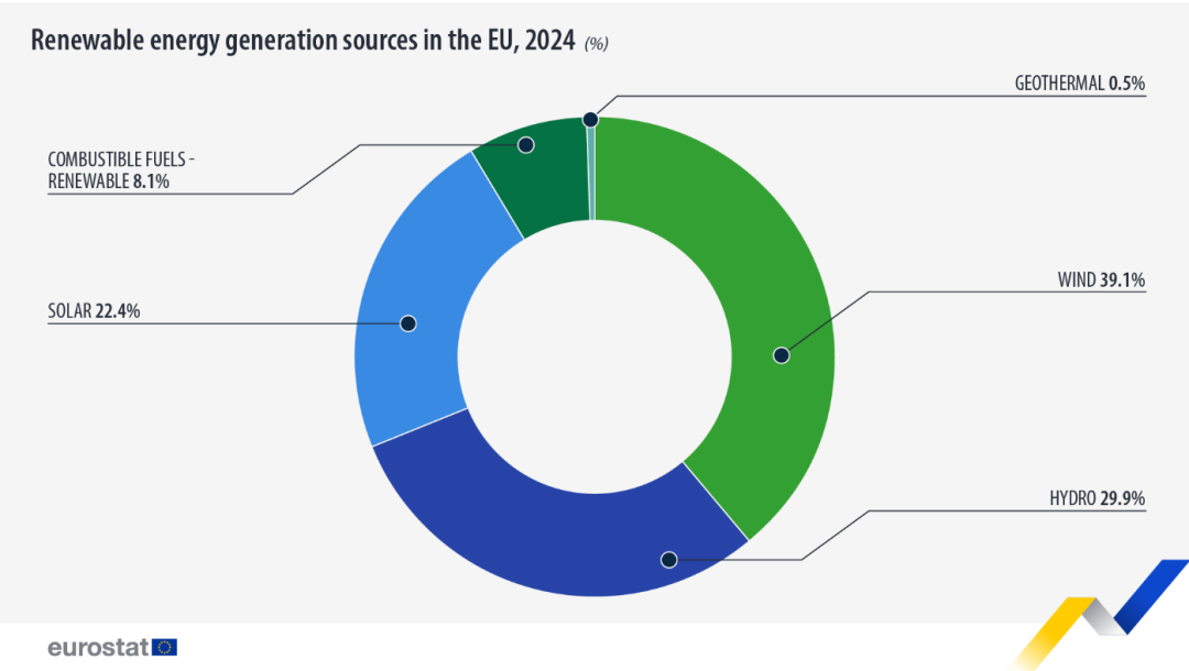 風(fēng)能和水能占?xì)W盟可再生能源發(fā)電總量的三分之二以上(分別為39.1%和29.9%)。其余三分之一的電力來(lái)自太陽(yáng)能(22.4%)、可燃燃料(8.1%),以及僅約0.5%來(lái)自地?zé)崮堋?/span>