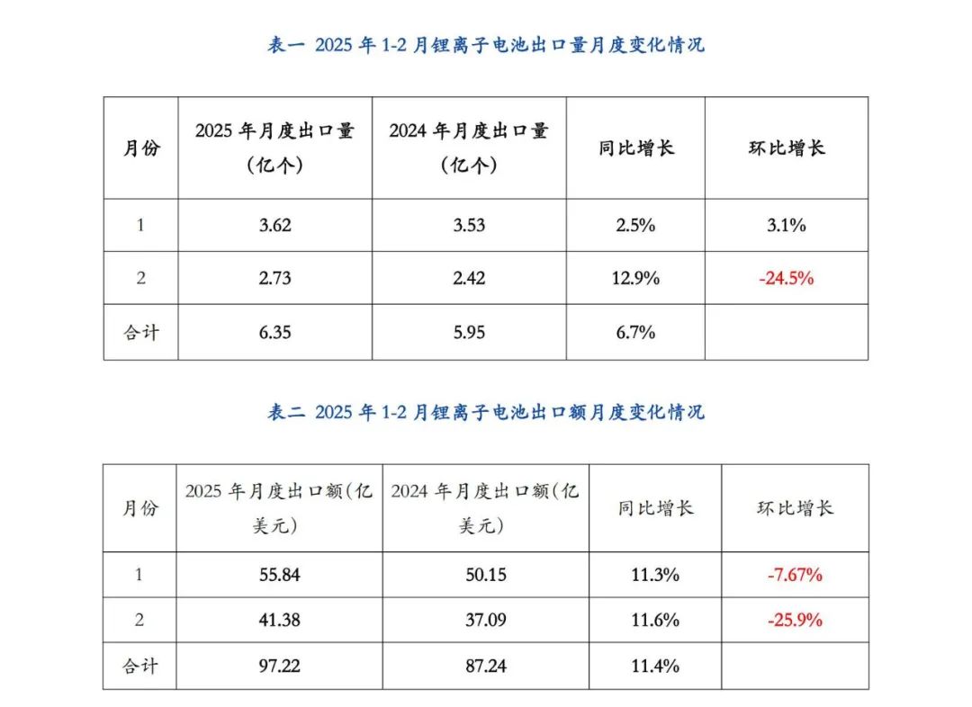 中國儲能網(wǎng)訊:2025年1-2月鋰離子電池出口數(shù)量為6.35億個(gè),同比增長12.9%;2025年1-2月我國鋰離子電池出口額為97.22億美元,同比增加11.4%,出口總體態(tài)勢良好。其中,2025年1、2月份出口額環(huán)比分別下降7.67%和25.9%,據(jù)分析,由于企業(yè)可能在節(jié)前集中完成訂單,春節(jié)假期導(dǎo)致生產(chǎn)與出口節(jié)奏放緩,進(jìn)而影響出口環(huán)比表現(xiàn)。出口“量增價(jià)減”趨勢延續(xù),尤其是在國際市場競爭加劇的背景下,企業(yè)可能通過降價(jià)策略爭奪市場份額。2024年碳酸鋰等原材料價(jià)格下行,傳導(dǎo)至出口價(jià)格存在滯后性,企業(yè)可能通過降價(jià)清庫存或提前鎖定低價(jià)訂單,進(jìn)一步壓縮利潤空間。