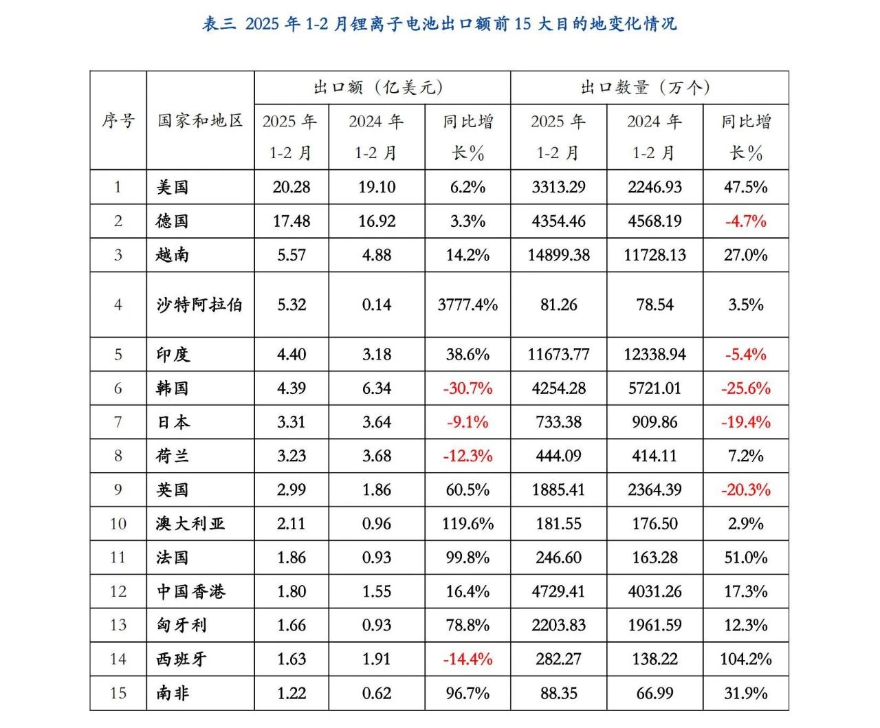 美國仍是我國鋰離子電池第一大出口市場,2025年1-2月出口美國金額為20.28億美元,同比增長6.2%,占我國鋰離子出口總額的22.5%。第二大市場仍為德國,出口金額為17.48億美元,同比增加3.3%,占我國鋰離子電池出口額的18%;越南代替2024年同期的韓國成為第三大出口市場,出口金額為5.57億美元,同比增長14.2%,占我國鋰離子電池出口額的5.7%。