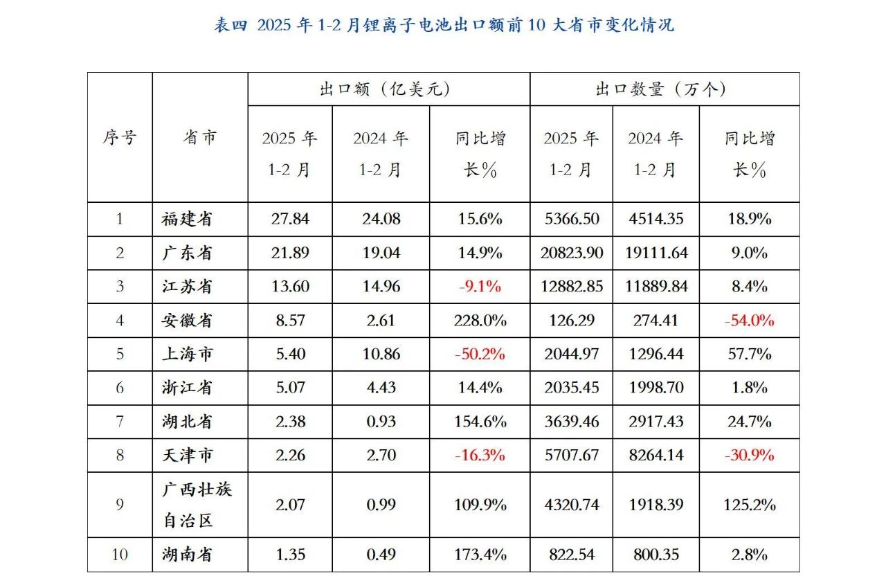 2025年1-2月福建省仍是我國鋰離子電池出口產(chǎn)品的最大來源地,出口金額為27.84億美元,同比增長15.6%,占我國鋰離子電池出口額的28.6%;出口數(shù)量為5366.5萬個(gè),同比增長18.9%。廣東省位居第二,出口金額為21.89億美元,同比增加14.9%,占我國鋰離子電池出口額的22.5%;出口數(shù)量20823.90萬個(gè),同比增長9%。江蘇省排名第三,出口額為13.6億美元,同比減少9.1%,占我國鋰離子電池出口額的14%;出口數(shù)量11889.84萬個(gè),同比增長8.4%。福建、廣東和江蘇三省的鋰離子電池出口額占到全國鋰離子電池出口額的65.1%。