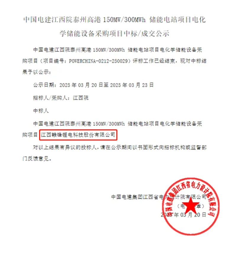 中國(guó)儲(chǔ)能網(wǎng)訊:近日,儲(chǔ)能行業(yè)被一則重磅消息點(diǎn)燃——江西贛鋒鋰電科技股份有限公司,成功攬獲中電建江西院泰州高港150MW/300MWh儲(chǔ)能電站項(xiàng)目電化學(xué)儲(chǔ)能設(shè)備采購(gòu)項(xiàng)目。這一傲人佳績(jī),猶如一記響亮的戰(zhàn)鼓,再度證明了贛鋒鋰電在儲(chǔ)能賽道上的深厚技術(shù)底蘊(yùn)與超凡產(chǎn)品實(shí)力,標(biāo)志著其在儲(chǔ)能市場(chǎng)的拓展進(jìn)程中邁出了堅(jiān)實(shí)有力的一步。
