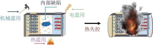 熱失控通常由各種濫用(如熱濫用、電濫用、機械濫用)觸發(fā)。同時,電池內(nèi)部潛在的電化學(xué)缺陷也可能成為潛在危害。熱失控觸發(fā)過程通常伴隨著煙霧、爆炸和火災(zāi)等能量釋放過程,圖2為鋰離子電池受到濫用或由于自身制造缺陷觸發(fā)熱失控的示意圖。