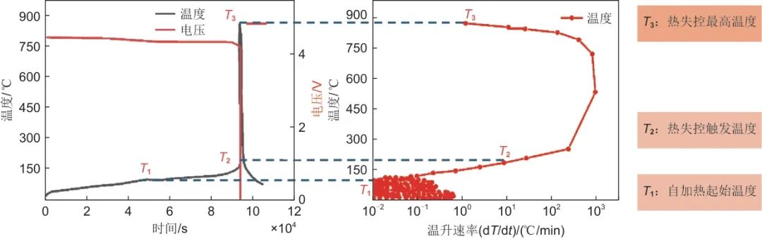 為了探究熱失控前后電池內(nèi)部的結(jié)構(gòu)變化及不同化學(xué)反應(yīng)過程,研究人員對不同體系的電池進行了不同的熱失控的觸發(fā)實驗,總結(jié)出了不同體系鋰離子電池單元在熱失控前后的共性,在單體層級為減緩熱失控過程提供理論依據(jù)。鋰離子電池?zé)崾Э販y試常用儀器如圖3所示,該系列裝置能夠測試不同熱失控觸發(fā)方式下電池的熱失控特征,包括熱失控特征溫度、在熱失控各溫度階段不同材料組分之間的化學(xué)反應(yīng)以及產(chǎn)熱產(chǎn)氣特征等。加速量熱法是分析電池單元的整體熱穩(wěn)定性的一種方法,加熱過程遵循“加熱-等待-搜尋”的標準流程,并提供絕熱環(huán)境。歐陽明高團隊使用加速絕熱量熱儀對鋰離子電池不同體系進行數(shù)次熱失控測試,最終總結(jié)出鋰離子電池3個熱失控的特征溫度,分別命名為T1、T2、T3,測試結(jié)果曲線如圖4所示,分別定義為電池自產(chǎn)熱起始溫度(溫升速率達到0.02 ℃/min)、熱失控觸發(fā)溫度(溫升速率達到1 ℃/s)以及熱失控最高溫度。3個特征溫度可以作為不同體系電池?zé)崾Э氐墓餐卣鳎援a(chǎn)熱的起始溫度代表著電池內(nèi)部材料結(jié)構(gòu)開始發(fā)生變化的時刻,熱失控觸發(fā)溫度代表著電池內(nèi)部快速氧化還原反應(yīng)的開始,也是電池失控的開始溫度,熱失控最高溫度代表電池能量釋放的最大點。因此,設(shè)計高安全電池的根本目標是提高自產(chǎn)熱起始溫度、熱失控觸發(fā)溫度,降低熱失控最高溫度。差示掃描量熱儀是通過測量物質(zhì)加熱過程中吸收的熱量來分析其理化特性,主要由加熱系統(tǒng)、檢測系統(tǒng)和數(shù)據(jù)處理系統(tǒng)組成。加熱系統(tǒng)采用電熱元件或激光加熱,控制環(huán)境溫度,通過檢測系統(tǒng)測量物質(zhì)吸收的熱量,一般采用熱電偶或熱輻射等測量技術(shù),最后將測量結(jié)果進行計算分析,可以用于研究化學(xué)反應(yīng)機理。同步熱分析儀質(zhì)譜聯(lián)用儀是測量物質(zhì)加熱過程中溫度—質(zhì)量變化關(guān)系以及對熱分解產(chǎn)生的氣體進行分析,從而對熱分解過程中的分解產(chǎn)物定性或定量研究。馮旭寧等使用差示掃描量熱儀和質(zhì)譜儀進行測試,將拆解后的電池的不同組分分別組合,在材料層面探究熱失控過程內(nèi)部的各種化學(xué)反應(yīng)過程。具體過程為,將單獨正極、單獨負極、正極+電解液、負極+電解液以及正極+負極+電解液的不同組合進行熱重(DSC)和熱分析-質(zhì)譜(STA-MS)測試,并結(jié)合對產(chǎn)氣元素分析得到熱失控不同階段及其對應(yīng)的化學(xué)反應(yīng)。