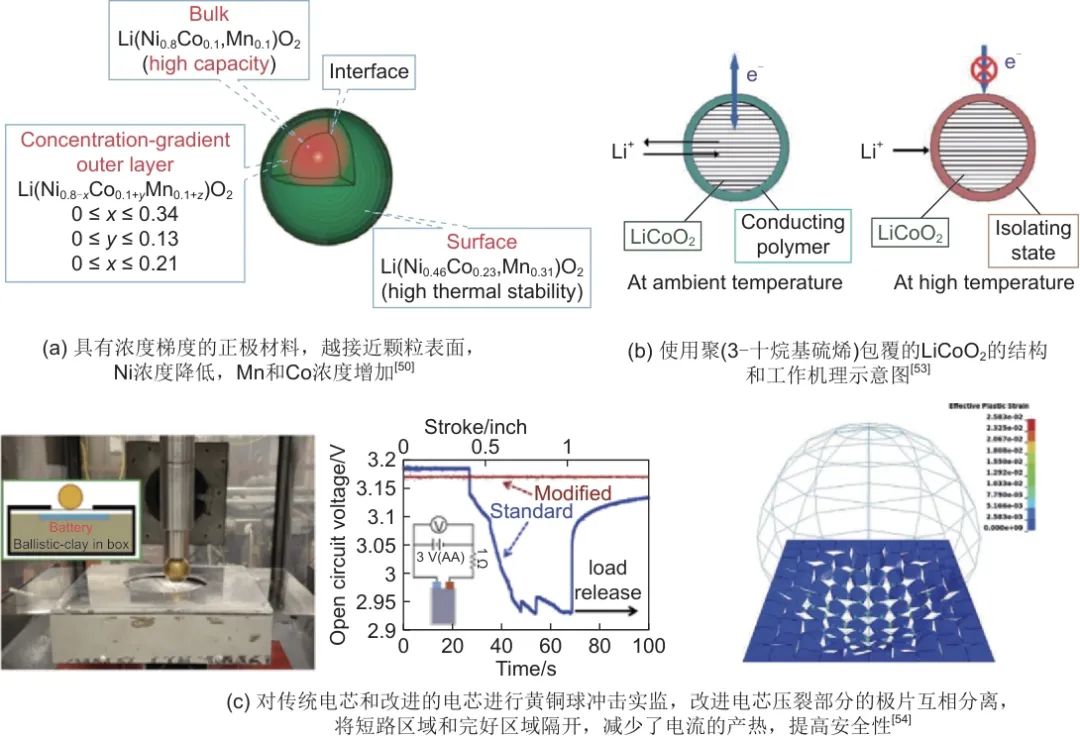 本文從熱失控觸發(fā)的潛在機理出發(fā),先概述了熱失控不同階段的產(chǎn)熱和產(chǎn)氣反應(yīng),并總結(jié)了在材料層面上研究人員根據(jù)不同階段化學(xué)反應(yīng)來改善不同組件結(jié)構(gòu),從而提高電池安全性的措施,如圖12所示。主要從非功能性組件如集流體和隔膜以及功能性組分入手,包括:①通過改變正極材料晶胞中元素比例和晶體表面形態(tài)提高材料穩(wěn)定性;②提高負極表面SEI膜的穩(wěn)定性和均勻性、優(yōu)化電解質(zhì)成分、設(shè)計三層的隔膜以及使用復(fù)合集流體來防止鋰枝晶的產(chǎn)生和生長;③在電解質(zhì)中添加氧化還原穿梭添加劑以及使用“聚合物-金屬-聚合物”隔膜來防止過充電對安全性的影響;④使用電解質(zhì)增稠劑,增加電解質(zhì)黏度,以及使用復(fù)合集流體來提高電池對機械濫用的耐受性;⑤通過直接在電解質(zhì)中添加阻燃劑、使用相變材料包裹阻燃劑或?qū)⒆枞紕┓湃敫裟せ驈?fù)合集流體中,來降低熱失控最后階段起火和爆炸的劇烈程度。