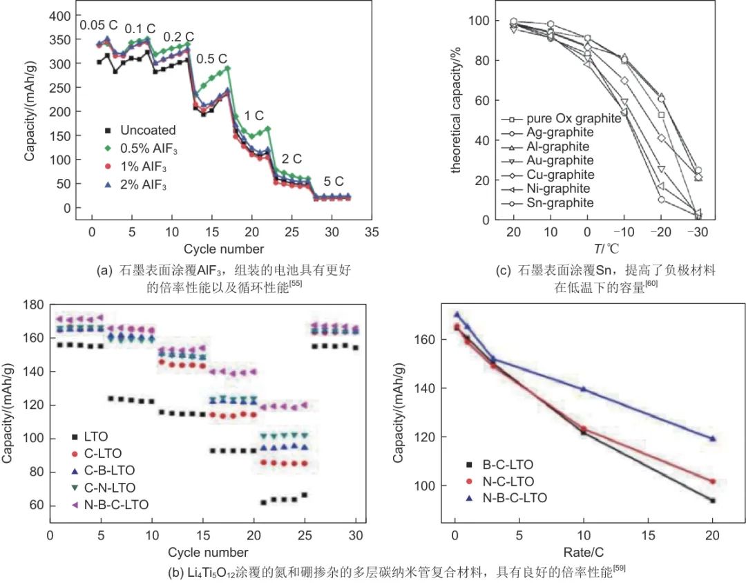 對于鋰離子電池的負極材料而言,與電解液反應(yīng)以及鋰枝晶的生長是兩個主要的安全隱患。通常副反應(yīng)以及鋰枝晶的形成發(fā)生在電極和電解液界面,因此,提高負極材料的安全性,就要保持良好的電極表面狀態(tài),可以通過表面改性來實現(xiàn)。負極表面的SEI膜對電池安全性有重要影響,近年來,研究人員研發(fā)出了人工SEI膜,以提高其熱力學(xué)性能。如,在石墨負極涂覆AlF3可以形成更穩(wěn)定、導(dǎo)電性更好的SEI膜,組裝的電池具有更好的倍率性能以及循環(huán)性能;Li4Ti5O12也是制造人工SEI膜常用的涂覆材料,通常與仲碳微珠、石墨、碳納米管、氮和硼摻雜的多層碳納米管復(fù)合材料等材料結(jié)合,可以使電池在快速充電時具有更好的循環(huán)性能和容量保持率,提高熱穩(wěn)定性;在石墨表面涂覆Sn可以提高負極材料在低溫下的容量和電子電導(dǎo)率,倍率性能也顯著提高,但需要控制涂層量,避免對電池電性能造成不利影響。無定形碳涂層的層間距較大且排列無序,能夠提高鋰離子的擴散速率,在石墨表面涂覆無定形碳可以提高石墨的可逆容量、循環(huán)穩(wěn)定性、倍率性能以及低溫性能。提高鋰離子的固相擴散速率有利于抑制鋰枝晶的形成和生長,主要包括增大石墨層間距和縮短鋰固相擴散距離。微膨脹處理及石墨擴邊處理可以增大石墨層間距,但微膨脹處理的石墨表面具有微缺陷降低了其可逆容量;使用納米碳材料可以縮短鋰固相擴散距離,然而,納米材料的高比表面積導(dǎo)致電極表面的副反應(yīng)增加,電池的庫侖效率下降。除此之外,SEI膜的形成還與電解液的成分有關(guān),在電解液中加入添加劑,有助于形成更均勻的SEI膜,減緩鋰枝晶的形成。具體方法在2.3節(jié)中概述。負極材料改善策略如圖7所示。