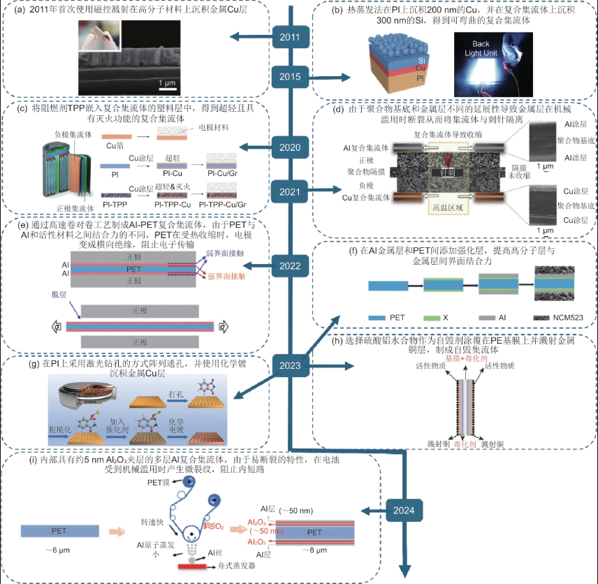 2011年,Yun等首次采用磁控濺射技術(shù)在塑料層上沉積了Cu金屬層,塑料層材料包括聚萘二甲酸乙二醇酯(PEN)、聚對苯二甲酸乙二醇酯(PET)、聚酰亞胺(PI)和聚醚砜(PES),并且測試了不同厚度金屬Cu層的復(fù)合集流體電阻。2015年,Jung等通過熱蒸發(fā),在PI基底上沉積了200 nm的Cu,又在PI-Cu集流體上沉積300 nm的納米Si,獲得可彎曲的復(fù)合集流體。2020年,Cui等通過將嵌入有磷酸三苯酯(TPP)阻燃劑的聚酰亞胺上沉積了500 nm的超薄Cu金屬層制成了超輕聚酰亞胺基集流體,這種設(shè)計將阻燃劑與電子或者離子通路隔斷,在電池正常工作時不影響性能,但當電池內(nèi)部溫度升高到TPP熔點250 ℃,TPP融化釋放到電池內(nèi)部,阻斷內(nèi)部組件的燃燒。并通過實驗驗證了在復(fù)合集流體中加入阻燃劑不影響電池正常工作。同時,將傳統(tǒng)電芯與加入阻燃劑的復(fù)合集流體電芯點燃,復(fù)合集流體火焰微弱,自熄滅時間為6 s小于傳統(tǒng)電芯的20 s。2021年,Pham等在聚合物基底涂覆Al金屬和Cu金屬層,并使用18650電池進行安全性能測試,在針刺測試過程中溫度升高引起聚合物基底收縮,使得正負極活性材料由于缺乏與集流體的結(jié)合而開裂,并且由于聚合物的收縮也使得復(fù)合集流體迅速撤離靠近針的部分,斷開電子的傳輸路徑,阻止內(nèi)短路的發(fā)生。2022年,黃云輝等采用高速卷對卷工藝制備了以PET為基底的Al-PET復(fù)合集流體。所得的復(fù)合集流體厚度為7.5 μm,面密度為1.15 mg/cm2。對復(fù)合集流體的力學(xué)性能以及電性能進行測試,并與厚度為14 μm(面密度3.89 mg/cm2)的傳統(tǒng)集流體比較,重量減小70.4%,厚度減小46.4%,金屬用量減少89.3%。不僅提高了比能量密度,也降低了成本,并且在單軸拉伸測試下,Al-PET集流體的彈性模量為5.1 GPa ± 0.1 GPa,斷裂應(yīng)變?yōu)?2% ± 4%,斷裂強度為196 MPa ± 21 MPa;而傳統(tǒng)集流體彈性模量為14.4 GPa ± 0.4 GPa,斷裂應(yīng)變3% ± 1%,斷裂強度為194 MPa ± 3M Pa。說明Al-PET復(fù)合集流體雖然減小了模量,但機械強度仍然足夠,滿足加工性能。并且,傳統(tǒng)集流體的斷裂應(yīng)變(大約為3%)和Al-PET復(fù)合集流體斷裂應(yīng)變(大約為92%)間具有較大差異,也解釋了Al復(fù)合集流體提高安全性的本質(zhì)原因。在不同拉伸程度時測試復(fù)合集流體電阻,發(fā)現(xiàn)電阻隨著拉伸應(yīng)變增加而增加,這使得電池在針刺測試時,電阻增加,防止了局部電導(dǎo)的突增,提高安全性。同時,觀察到在拉伸過程中,涂覆有活性材料的復(fù)合集流體的Al-PET隨著拉伸寬度變窄,而活性材料層并沒有顯著變形,并且活性材料從集流體上脫落,說明Al與PET之間具有強的界面結(jié)合力,與活性材料間結(jié)合力較弱。因此,在電池受到熱濫用之前,變成橫向絕緣,阻止后續(xù)反應(yīng)的發(fā)生。但復(fù)合集流體中間添加了高分子層,由于其對電解質(zhì)的耐受性較差,浸泡在電解質(zhì)中會產(chǎn)生高分子層與金屬層脫層的現(xiàn)象。2023年,汪茹等采用PET作為支撐基材,通過在鋁金屬鍍層與高分子基材之間引入氧化物(AlOx或SiOx)中間層,有效增強了金屬與高分子基材之間的界面結(jié)合力,提升復(fù)合集流體的電解液兼容性。2023年,Wu等為了增強金屬層與高分子層之間界面結(jié)合力,通過在高分子層聚酰亞胺(PI)上采用激光鉆孔的方式陣列通孔,并采用化學(xué)鍍的方法在聚酰亞胺薄膜上沉積金屬Cu層。這種工藝方法不僅降低重量,提高力學(xué)性能,還提高接觸面積,增大導(dǎo)電面積,減小電池電阻。并且,打孔陣列和鍍層的粗糙表面為活性材料提供了更高的鍵合,相較于光滑的銅箔不易分離,提高了電池的循環(huán)性能。為了打斷電池在熱失控早期的一些副反應(yīng),2023年,彭勇等首次提出自毀電池的概念,并對自毀電池的研究進展進行了總結(jié)。在探究清楚電池?zé)崾Э貦C理的基礎(chǔ)上,通過在特定條件下釋放化學(xué)試劑,對電池內(nèi)部熱失控前期特定化學(xué)反應(yīng)進行阻斷,實現(xiàn)材料層面的自毀。選擇自毀劑為硫酸鋁水合物,和其他漿料一起攪拌均勻后涂覆在PE基膜上,并采用磁控濺射Cu金屬層,制備成了含有自毀劑的復(fù)合集流體,并組裝成電芯。根據(jù)徐鵬等對硫酸鋁水合物進行的熱重分析,樣品的首次失重在90 ℃左右開始直到300 ℃附近,失重率為38.22%。因此,選擇硫酸鋁水合物作為自毀劑可以在特定的溫度下釋放出水,提前于電解質(zhì)與負極活性Li反應(yīng),消耗副反應(yīng)的反應(yīng)物,降低熱失控程度。2024年,彭勇等在聚對苯二甲酸乙二醇酯的塑料基底上通過真空蒸發(fā)法涂覆內(nèi)部具有約5 nm Al2O3夾層的多層Al,Al-Al2O3多層金屬層固有的易斷裂特性使其在受到機械變形時產(chǎn)生微裂紋,有利于切斷短路,抑制進一步的熱失控發(fā)生。集流體的發(fā)展現(xiàn)狀如圖8所示。