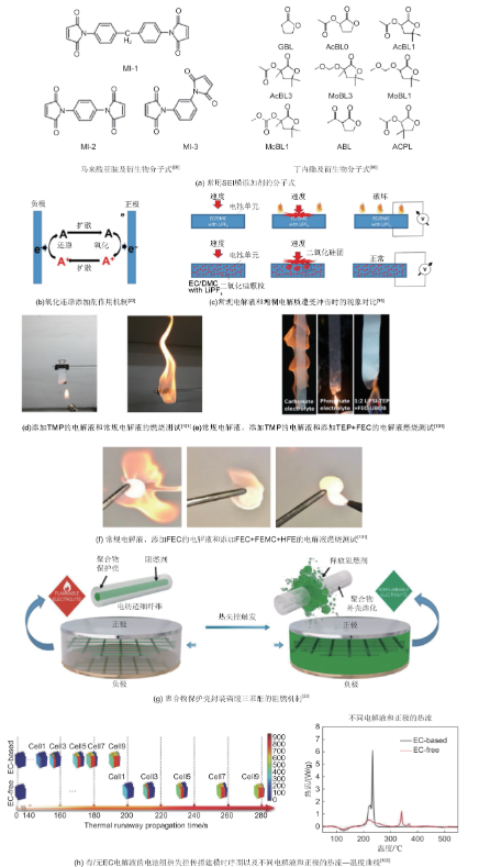 當熱失控早期反應(yīng)無法有效阻斷時,為避免后續(xù)更嚴重的火災(zāi)和爆炸,研究人員向傳統(tǒng)的有機電解質(zhì)中添加阻燃劑或者使用不可燃的電解質(zhì)。當可燃物在氧化劑的作用下受熱會產(chǎn)生化學(xué)反應(yīng)并燃燒,產(chǎn)生可燃烴和氧等自由基。最常用的阻燃劑是含磷或者含鹵素的材料,可以通過捕獲自由基來阻止后續(xù)燃燒。阻燃劑要滿足:①少量時仍具有高的阻燃效率;②常規(guī)電解質(zhì)中良好的溶解性;③低揮發(fā)性;④在電解質(zhì)中具有低黏度;⑤良好的電化學(xué)穩(wěn)定性;⑥與電極和隔膜良好的浸潤性。常用的阻燃添加劑包括磷酸鹽(如磷酸三甲酯TMP、磷酸三乙酯TEP、甲基膦酸二甲酯DMMP;優(yōu)點:阻燃效果好、成本低;缺點:黏度高、會在負極分解)、氟化物和氟化磷酸鹽(如氟代碳酸亞乙酯FEC、甲基九氟丁基醚MFE;優(yōu)點:黏度低、電化學(xué)穩(wěn)定性好、有助于SEI膜形成;缺點:成本高)和氟化磷腈(優(yōu)點:阻燃效率高、電化學(xué)穩(wěn)定性好、有助于SEI膜形成;缺點:黏度高、成本高)。在濫用條件下,根據(jù)研究人員的測試,添加了阻燃劑的電解質(zhì)不會被點燃。只添加一種阻燃劑產(chǎn)生的阻燃效果不明顯,通常多種阻燃元素的協(xié)同作用產(chǎn)生的阻燃效率高,并且具有穩(wěn)定的電化學(xué)性能和良好的熱穩(wěn)性,如氟化磷酸酯、氟化磷腈的協(xié)同阻燃添加劑。然而,直接將阻燃劑添加到電解質(zhì)中可能會影響電解質(zhì)的電導(dǎo)率,從而影響電池電性能。研究人員為解決此問題,設(shè)計了一種將磷酸三苯酯封裝在保護性聚合物殼內(nèi),防止阻燃劑直接暴露于電解質(zhì),如果電池發(fā)生熱失控,則聚合物殼將隨著溫度升高而熔化,釋放磷酸三苯酯,有效抑制高度易燃電解液的燃燒。提高電解質(zhì)安全性的根本是開發(fā)出不可燃的電解質(zhì),包括已經(jīng)使用的離子液體電解質(zhì),具有非揮發(fā)性,但黏度高、成本高以及倍率性能低等;低分子量氫氟醚是另一類不可燃液體電解質(zhì),因為它們具有高閃點或無閃點、不可燃性、低表面張力、低黏度、低凝固溫度等特性。全氟聚醚(PFPE)是已經(jīng)研發(fā)出來的氫氟醚電解質(zhì),它可以確保它的分子與電池內(nèi)部的相容性,同時具有不燃性和好的熱穩(wěn)性。在傳統(tǒng)鋰離子電池研究中,鋰離子的可逆脫嵌是通過電解質(zhì)中EC對石墨負極的良好鈍化來保證的,并且EC較寬的電化學(xué)窗口使得電池在各種工況下工作,所以,具有EC的電解質(zhì)運用廣泛。但由于EC高溫下容易分解降低了電池的熱安全性也限制了具有EC電解質(zhì)的發(fā)展。2014年,Yamada等首次提出,在使用超高鹽濃度的電解液而不使用EC時,也可以使電解液和石墨負極之間實現(xiàn)良好的匹配。無EC電解液是一種新型的電解液,它通過將當前電解液體系中的EC成分換成醚類、砜類、氟化碳酸鹽等來提高電池性能。為了提高電池的熱安全性,Wu等使用無EC電解液構(gòu)建了富含無機物的界面膜,使得電池的耐高低溫性能得到提升。電解質(zhì)的改善策略示意圖如圖9所示。