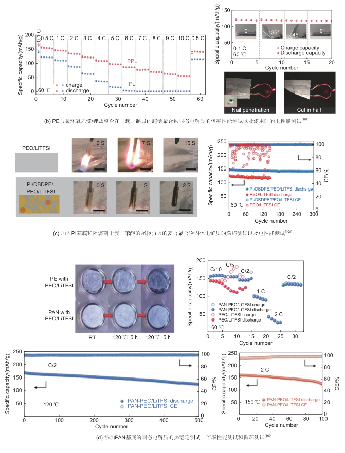 研究人員已經(jīng)采用各種優(yōu)化設(shè)計來提高液體電解質(zhì)的安全性,但非揮發(fā)性的固態(tài)電解質(zhì)具有更高的安全性,固態(tài)電解質(zhì)可以為電池提供機械支撐,在機械濫用下也能防止短路,并且近年來已經(jīng)開始研究并對其性能進行優(yōu)化。Wang等為了改善固態(tài)電解質(zhì)厚度較大以及機械強度較差等問題,在聚合物固態(tài)電解質(zhì)中又添加了聚合物基底PI膜,納米纖維PI膜孔隙率為82%,是均勻和獨立的網(wǎng)絡(luò)結(jié)構(gòu),促進了聚合物電解質(zhì)的滲透,保證在復(fù)合電解質(zhì)中進行有效的離子移動。同時,更薄且具有更高強度的PI層可以阻擋鋰枝晶的生長,提高電池安全性的同時保持了良好的倍率性能和循環(huán)穩(wěn)定性。雖然固態(tài)電池具有更高安全性,但室溫下離子電導(dǎo)率較差,限制其發(fā)展。為了解決此問題,Wu等將PE與聚環(huán)氧乙烷(PEO)/鋰鹽整合在一起,制成超薄聚合物固態(tài)電解質(zhì)(約7.5 μm),縮短了鋰離子在電解質(zhì)中的擴散距離和時間,并在室溫下有足夠的離子電導(dǎo)。對改進的固態(tài)電池進行電性能和機械柔性進行測試,結(jié)果表明,在30 ℃、0.1 C倍率下能夠保持穩(wěn)定的循環(huán),在60 ℃、1 C倍率下也能夠?qū)崿F(xiàn)500次循環(huán)。此外,在不同彎曲程度下連續(xù)充放電,容量不受彎曲程度影響,說明改進的固態(tài)電解質(zhì)具有良好的機械柔性;并且同其他現(xiàn)有技術(shù)相比,此優(yōu)化策略具有最好的倍率性能。Cui等設(shè)計了一種超輕防火的復(fù)合聚合物固體電解質(zhì),固態(tài)電解質(zhì)組成:多孔機械增強劑(PI)、阻燃劑(十溴二苯醚)和聚合物電解質(zhì)。并通過測量超輕防火電解質(zhì)的自熄滅時間以對阻燃性進行評估,同時,和不含有PI以及阻燃劑的原始固態(tài)電解質(zhì)(自熄滅時間為15 s)相比,超輕防火電解質(zhì)的自熄滅時間顯著減小(2 s),證明了其優(yōu)異的阻燃性。Ma等使用靜電紡絲設(shè)備將聚丙烯腈(PAN)基質(zhì)在靜電力作用下紡織成膜,通過靜電紡絲得到的膜均勻獨立且具有柔性。為了使膜薄且致密,有利于更好的抑制鋰枝晶的形成,將得到的薄膜輥壓,最后浸漬聚環(huán)氧乙烷/Li鹽電解質(zhì)得到改進的固態(tài)電解質(zhì)。并證明了在大電流下可以有效抑制鋰枝晶生長,并且具有良好的倍率性能、循環(huán)穩(wěn)定性和熱穩(wěn)定性。固態(tài)電解質(zhì)的改善策略如圖10所示。
