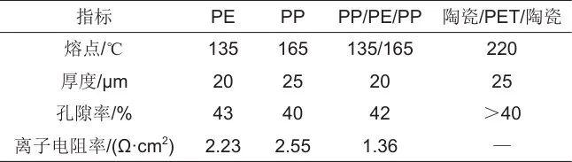 表1 常用商用隔膜的典型特征