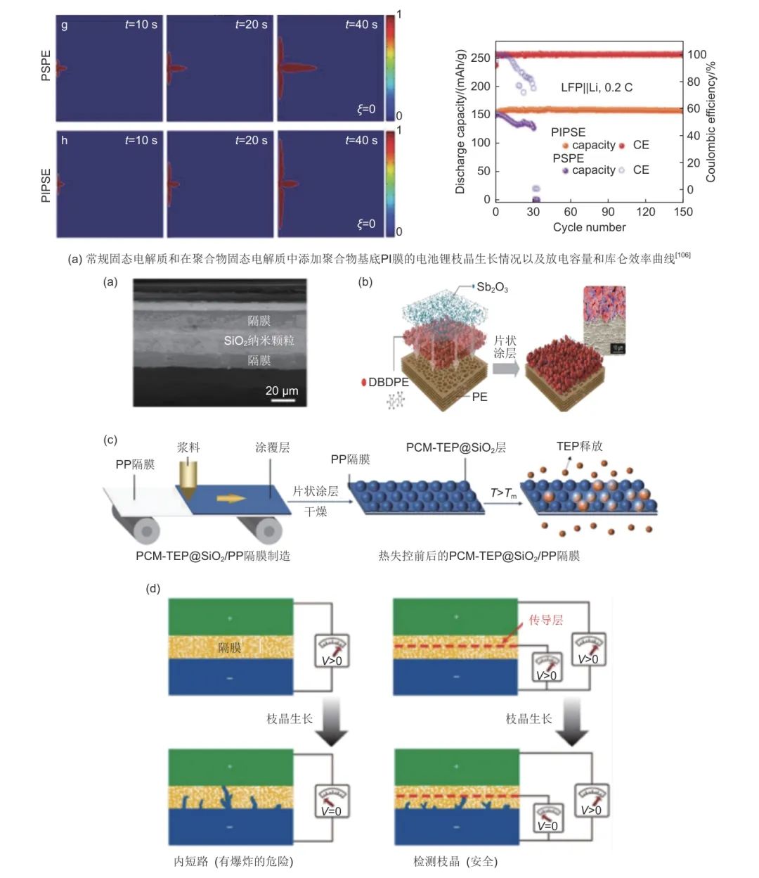 圖11 隔膜的改善策略 (a) 具有SiO2納米顆粒夾層的隔膜,能夠阻止鋰枝晶的生長,延長電池壽命;(b) 涂有三氧化二銻與阻燃劑十溴二苯醚的隔膜,大大提高阻燃性;(c) 涂覆內(nèi)部封裝有相變材料和阻燃劑的二氧化硅微膠囊的隔膜,具有阻燃性且不影響倍率性能;(d) 用于鋰枝晶早期檢測的雙功能隔膜,由兩個隔膜和中間的導(dǎo)電Cu層組成