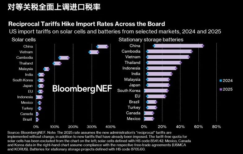 對各國的進口關稅差異很大,許多國家面臨的稅率高于全面適用的10%。10%的稅率從4月5日起實施,針對具體國家的關稅將于4月9日生效。受沖擊最大的是亞太地區(qū):根據(jù)這項新政策,對柬埔寨、越南和中國進口產(chǎn)品的關稅稅率將分別飆升至49%、46%和34%。自中國進口的一系列清潔能源已經(jīng)面臨高關稅;這些關稅還會進一步提高。