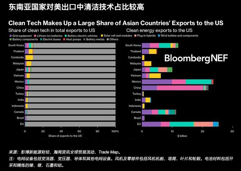 對東亞和東南亞國家而言,這一份額大得多。例如,柬埔寨去年對美國的清潔技術產(chǎn)品出口額僅8.2億美元,而歐盟的出口額為250億美元,但這些出口占柬埔寨對美出口額的9%以上。盡管總體而言,柬埔寨對清潔能源出口的依賴程度較高,但各國對每個特定能源轉(zhuǎn)型領域的敞口卻不盡相同:柬埔寨主要出口光伏產(chǎn)品,而韓國則出口電池、電池金屬和新能源汽車。