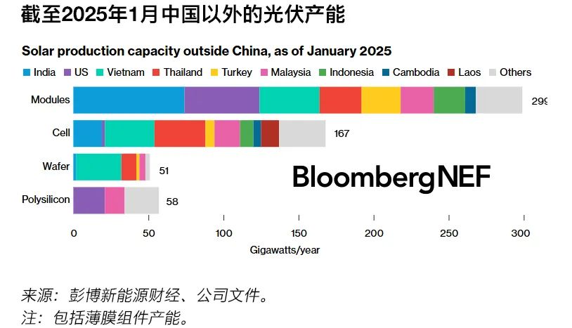 印尼、老撾和馬來西亞的綜合稅率在東南亞最低,彭博新能源財經(jīng)預計這些國家將成為最大的對美國光伏出口市場。根據(jù)彭博新能源財經(jīng)追蹤的數(shù)據(jù),截至2025年1月,這三個國家的電池片產(chǎn)能合計為38GW,是印度的兩倍。越南和泰國共擁有67GW的電池產(chǎn)能,這兩個國家的制造商需繳納120%的總關稅,因此將更加難以向美國銷售電池片。它們將需要降低利潤率和削減成本,以保持競爭力。