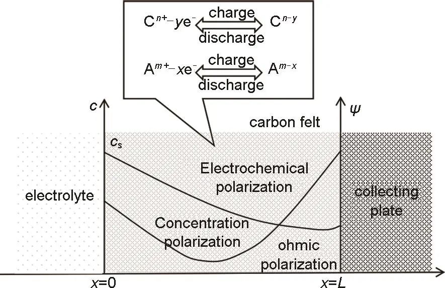 圖1 液流電池的極化示意圖,其中L表示碳氈厚度,c表示電解液濃度,cs為電解液在碳氈端面上的濃度,ψl為液相電勢,ψs為固相電勢