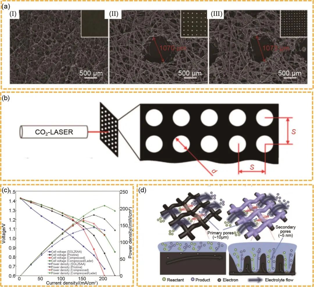 圖4 (a) 碳紙的SEM圖像和數(shù)碼照片;(b) 激光穿孔電極示意圖;(c) 50%充電狀態(tài)下的極化和功率密度曲線;(d) 雙尺度多孔電極結(jié)構(gòu)