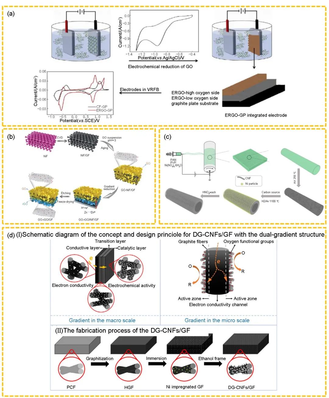 圖6 (a) 新型復(fù)合電極(ERGO-GP)的制備示意圖及循環(huán)伏安圖;(b) 雙功能梯度GO-rGO/GF電極材料的制造過程;(c) CNF-AECF電極的合成過程;(d) DG-CNFs/GF電極及合成過程