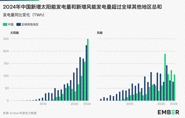全球能源轉(zhuǎn)型過程中,中國(guó)起到了關(guān)鍵推動(dòng)作用。2024年,中國(guó)新增太陽(yáng)能和風(fēng)能發(fā)電量分別占全球總量的53%與58%,遠(yuǎn)超其他地區(qū)總和。其中,太陽(yáng)能發(fā)電量占比全球達(dá)8.3%,是三年前2021年的一倍多。中國(guó)的清潔能源的增長(zhǎng)滿足了國(guó)內(nèi)81%的新增電力需求,遠(yuǎn)高于過去五年平均52%的水平。