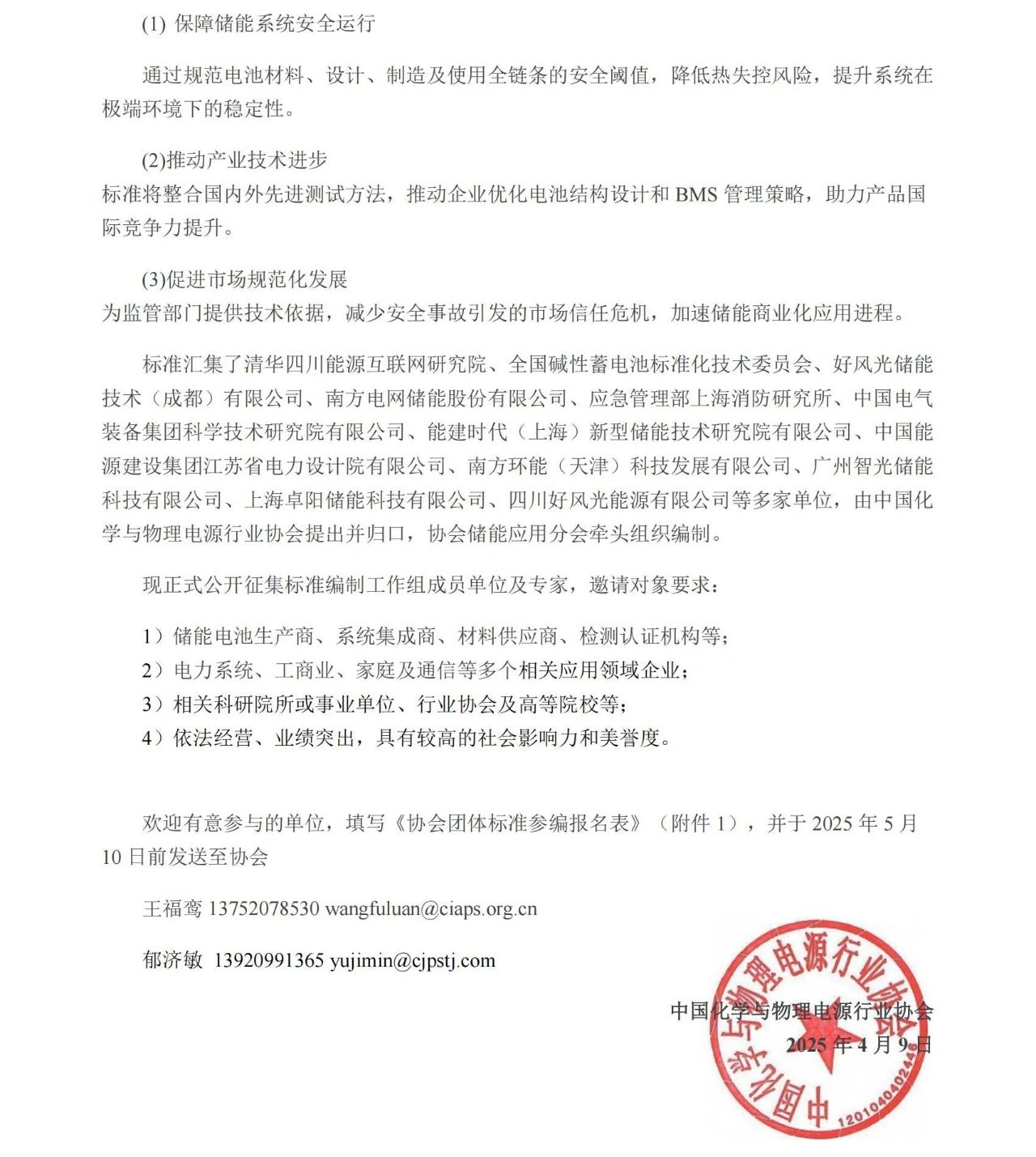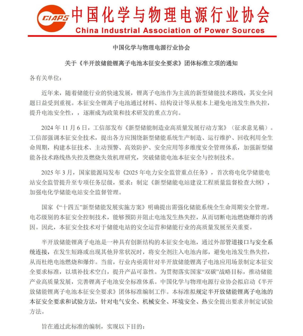 中國化學(xué)與物理電源行業(yè)協(xié)會(huì)關(guān)于《半開放儲(chǔ)能鋰離子電池本征安全要求》團(tuán)體標(biāo)準(zhǔn)立項(xiàng)的通知