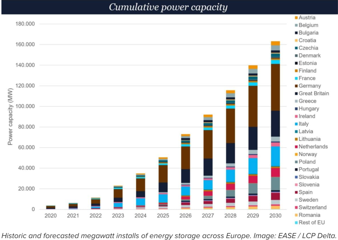 LCP Delta預(yù)測(cè),到2030年,將新增安裝128吉瓦/300吉瓦時(shí)的電化學(xué)儲(chǔ)能,這意味著到本十年末,歐洲累計(jì)安裝的儲(chǔ)能系統(tǒng)(主要是電池儲(chǔ)能)將達(dá)到約163吉瓦。市場(chǎng)復(fù)蘇和增長(zhǎng)加速可能會(huì)在2027年左右出現(xiàn),電力成本上升、價(jià)格尖峰和波動(dòng)性以及新商業(yè)模式等因素將推動(dòng)這一變化。歐盟委員會(huì)試圖為儲(chǔ)能開發(fā)商“明確規(guī)則”,特別是圍繞國(guó)家補(bǔ)貼規(guī)則。歐盟清潔工業(yè)協(xié)議一攬子計(jì)劃包括清潔工業(yè)國(guó)家補(bǔ)貼框架。該框架旨在支持可再生能源的采用,助力工業(yè)脫碳,并促進(jìn)整個(gè)價(jià)值鏈的清潔能源制造。成員國(guó)若要獲得補(bǔ)貼資格,每個(gè)國(guó)家都需要進(jìn)行市場(chǎng)改革,以確保儲(chǔ)能系統(tǒng)能夠進(jìn)入批發(fā)市場(chǎng),提供頻率和非頻率輔助服務(wù),并提供基于市場(chǎng)的調(diào)度或電網(wǎng)擁堵管理服務(wù)。換句話說,各國(guó)需要證明國(guó)家補(bǔ)貼支持的儲(chǔ)能項(xiàng)目有合理的商業(yè)依據(jù),而不是單純?yōu)榱私ㄔO(shè)而補(bǔ)貼。
