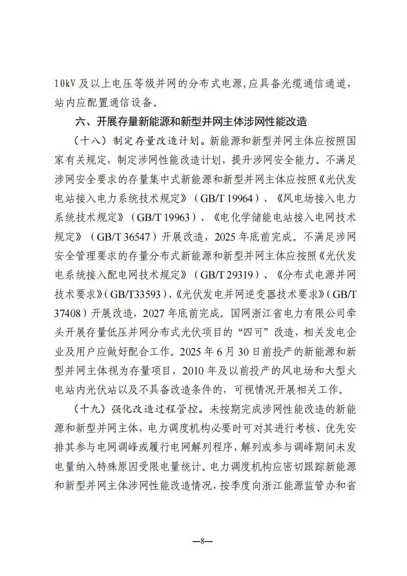 中國儲(chǔ)能網(wǎng)訊:4月15日,浙江能監(jiān)辦發(fā)布《關(guān)于進(jìn)一步提升浙江省新能源和新型并網(wǎng)主體涉網(wǎng)安全能力的通知(征求意見稿)》。文件提出,110kV及以上風(fēng)電場(chǎng)、10(6)kV及以上光伏和10(6)kV及以上電化學(xué)儲(chǔ)能應(yīng)具備緊急控制、一次調(diào)頻、有功控制、無功控制、高電壓穿越、低電壓穿越功能目滿足相應(yīng)的電壓適應(yīng)性、頻率適應(yīng)性要求,110kV及以上風(fēng)電場(chǎng)、35kV 及以上且交流側(cè)裝機(jī) 10MW 及以上光伏、10(6)kV及以上電網(wǎng)側(cè)儲(chǔ)能應(yīng)具備AGC、AVC功能,10kV及以上電壓等級(jí)電化學(xué)儲(chǔ)能應(yīng)同時(shí)具備慣量響應(yīng)功能。