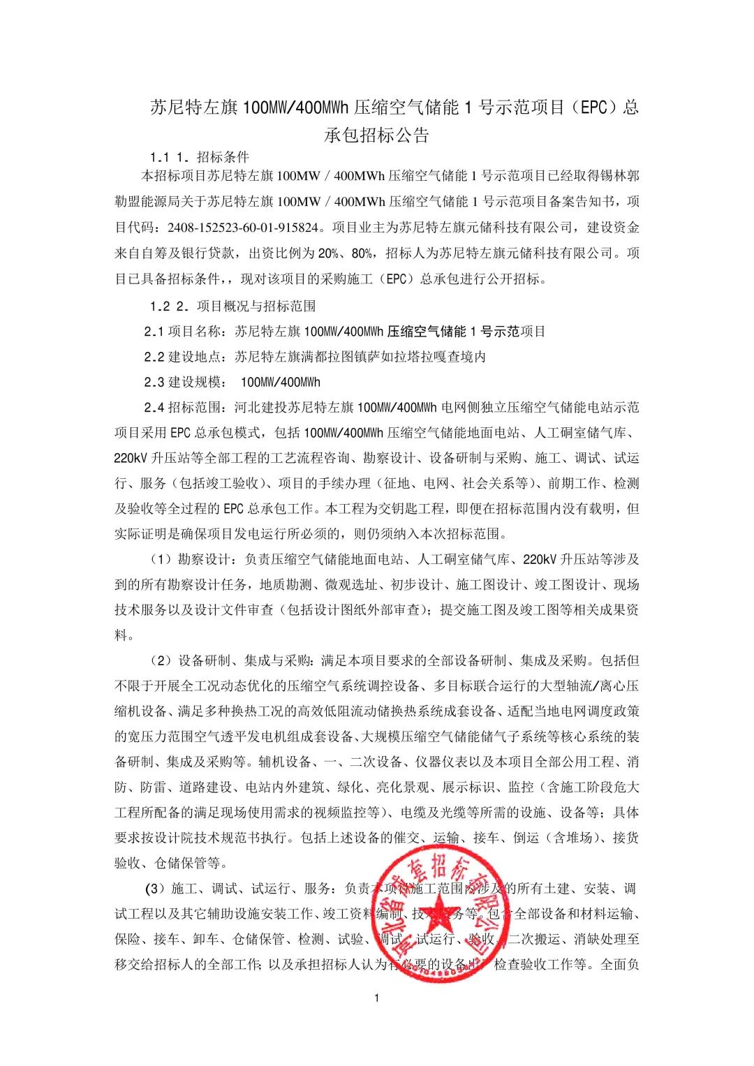 招標范圍:河北建投蘇尼特左旗100MW/400MWh電網(wǎng)側(cè)獨立壓縮空氣儲能電站示范項目采用EPC總承包模式,包括100MW/400MWh壓縮空氣儲能地面電站、人工硐室儲氣庫、220kV升壓站等全部工程的工藝流程咨詢、勘察設(shè)計、設(shè)備研制與采購、施工、調(diào)試、試運行、服務(wù)(包括竣工驗收)、項目的手續(xù)辦理(征地、電網(wǎng)、社會關(guān)系等)、前期工作、檢測及驗收等全過程的EPC總承包工作。本工程為交鑰匙工程,即便在招標范圍內(nèi)沒有載明,但實際證明是確保項目發(fā)電運行所必須的,則仍須納入本次招標范圍。