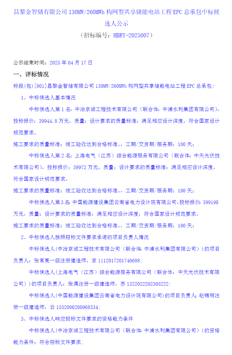 中國儲能網(wǎng)訊:4月14日,昌黎金智儲有限公司130MW/260MWh構網(wǎng)型共享儲能電站工程EPC總承包中標候選人公示。根據(jù)公示,中冶京誠工程技術有限公司(聯(lián)合體:中浦水利集團有限公司)以投標報價1.536元/Wh預中標。